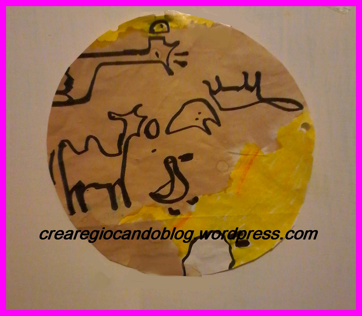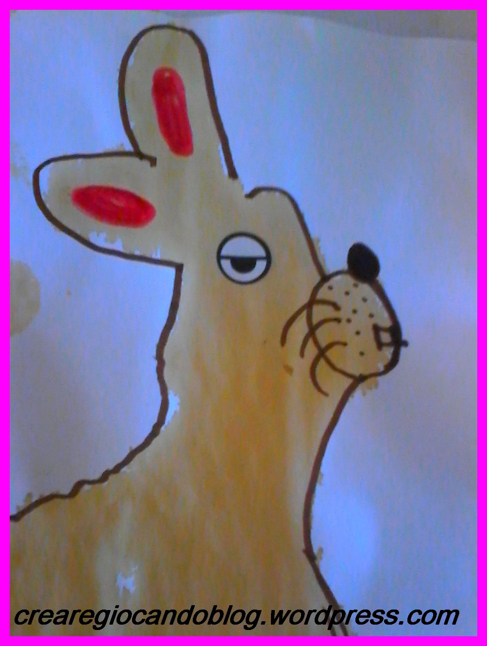 Poi un coniglietto e per finire delle decorazioni da appendere. Con i fogli dove c’era troppo caffè abbiamo pitturato di giallo e fatto delle figure sopra