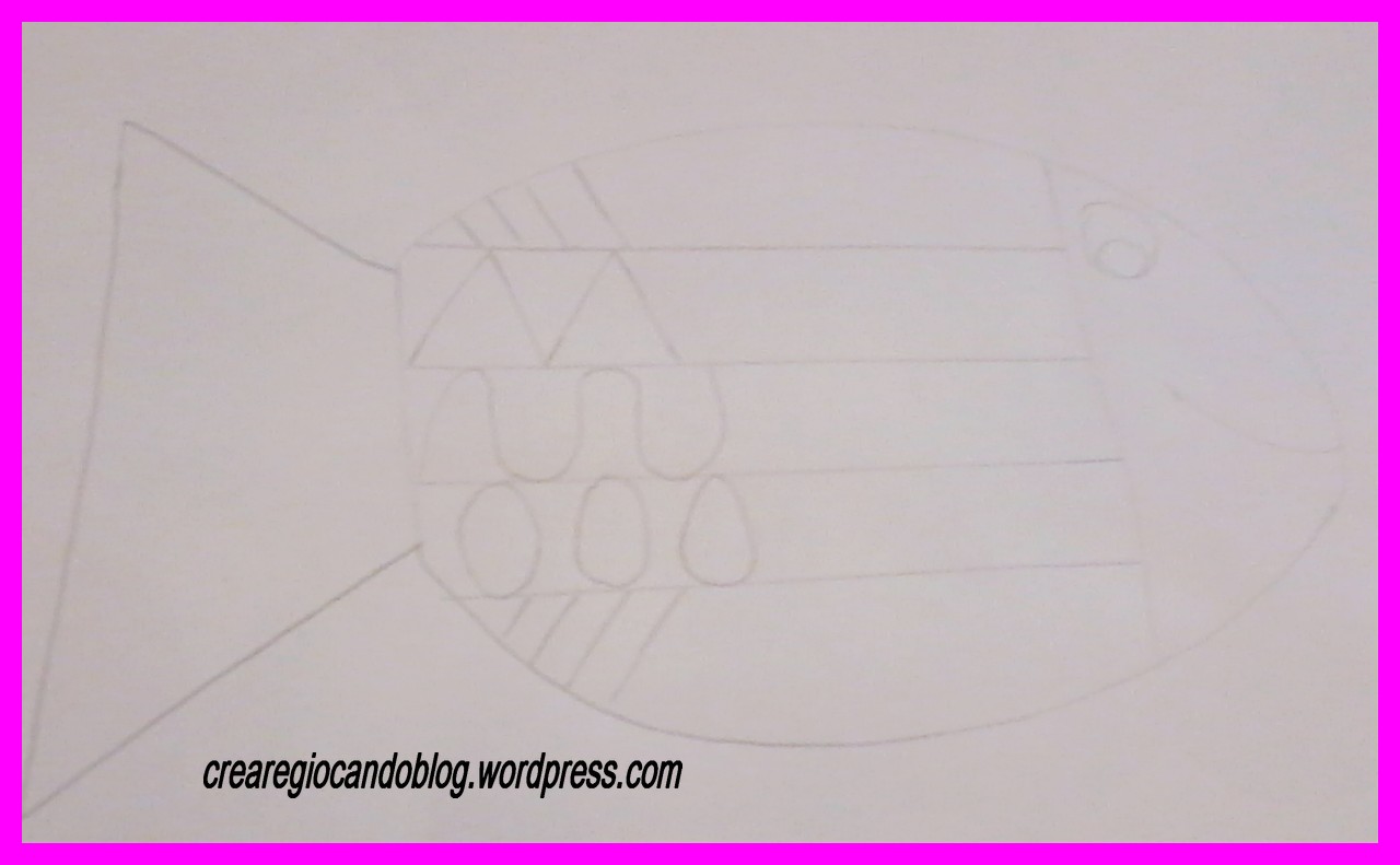 Come vedete dalle foto sopra, noi abbiamo prima disegnato un pesce, poi tracciato delle linee e all’ interno dei disegni (ovviamente solo l’inizio che poi il bambino dovrà copiare) per finire colorare il tutto