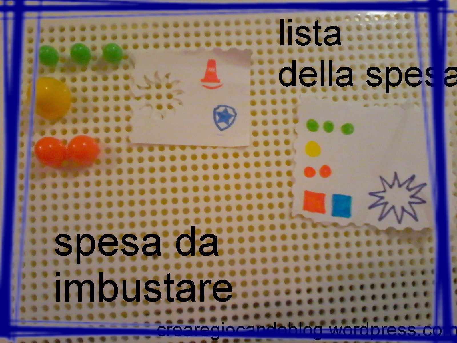 Solita lista della spesa, come vedete dalla foto i ‘chiodi’ il negoziante li prepara alla stessa maniera dei più piccoli, ma oltre a questo devono vedere che tipo di fustella devono usare Sulla carta (sarà un buco di trapano) e allo stesso modo i timbri (indicati con un quadrato) dello stesso colore (più difficile da spiegare che da fare, potete capire meglio dalle foto) fatto questo dovranno fare il conto (sulla cassa supermercato, a mente o calcolatrice) e dirvi il prezzo (tutto costa 1 euro per facilitare oppure i timbri piccoli o i buchi più piccoli 0,50 vedete voi) e alla fine mettere tutto nel sacchetto, darvi il resto giusto!!!! Chiaramente x rendere il gioco più divertente dovrete di volta in volta fare un personaggio diverso che entra nel negozio ( x questo meglio che prepariate prima le liste della spesa, io non le ho fatte perché magari avete chiodini di colore diverso) oppure ancora improvvisare la spesa o aggiungere dei pezzi (per i più grandi stuzzicadenti o il filo per legare l’arrosto possono prendere il posto del filo di ferro ad esempio!)