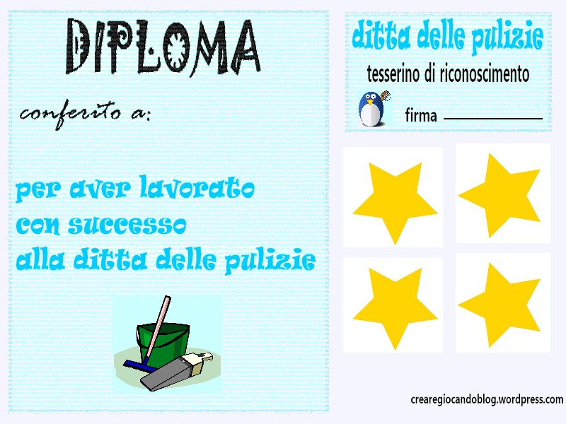 Il bimbo o bimba ancora non lo sa ma è stato scelto per lavorare nella Ditta delle Pulizie, quindi stampate e incollate su cartoncino il tesserino di riconoscimento, tagliate le stelline e tenete da parte il diploma.