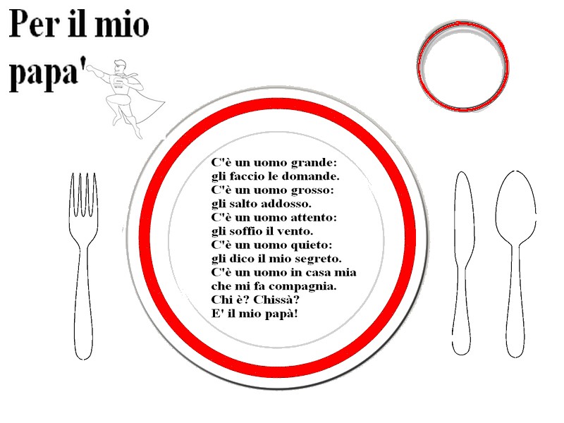 Questa volta troverete 2 versioni, una più semplice con un disegno di un Super papà all’interno del piatto, l’altra con superpapà piccolino e all’interno una poesia di Rodari.