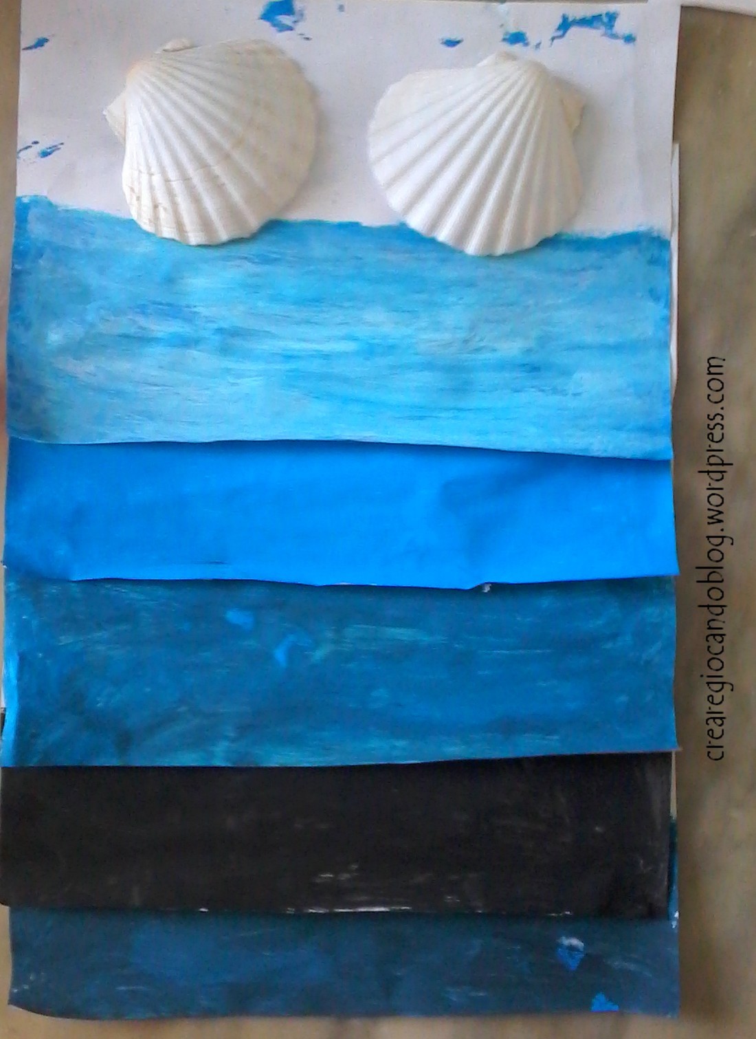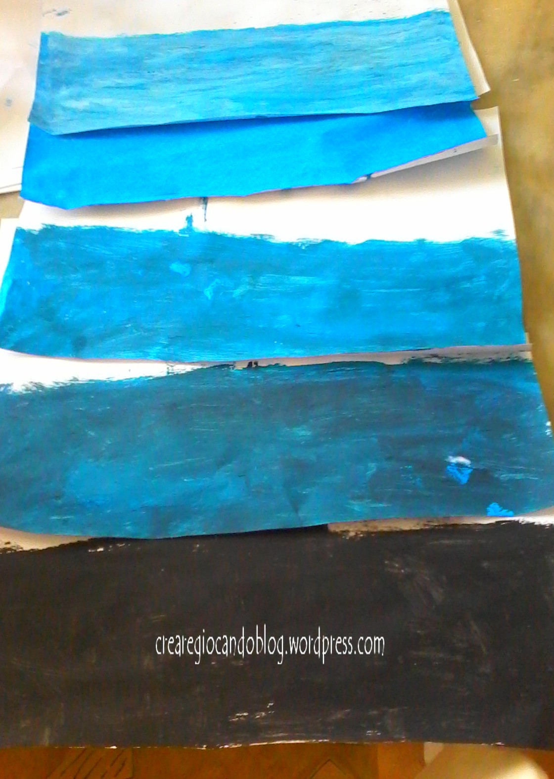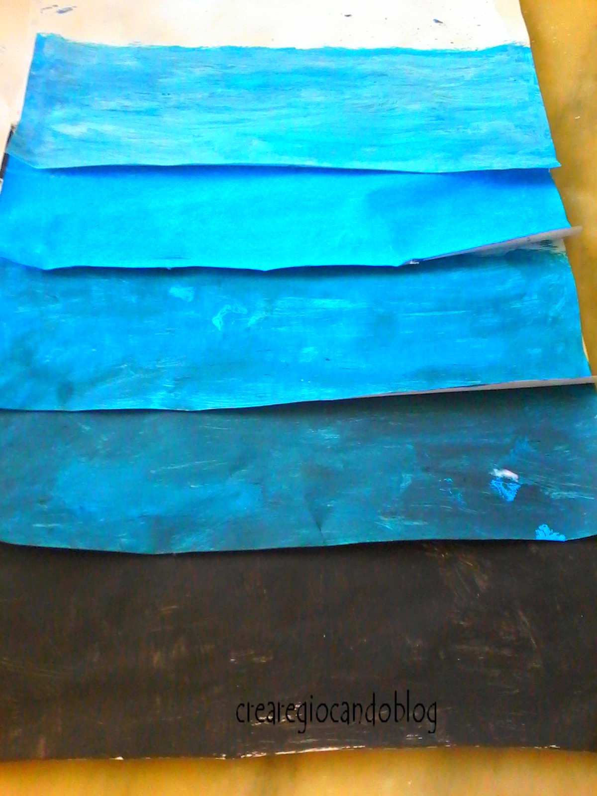 Lo strato appena sopra fatelo con il blu e via via andate a fare le zone sempre piu’ chiare come vedete da foto! Naturalmente non serve colorare tutto il foglio ma solo la parte in fondo perche’ poi verra’ sovrapposto l’altro foglio e cosi’ via fino ad arrivare allo strato superficiale. Se volete potete incollarli, altrimenti lasciateli cosi’.