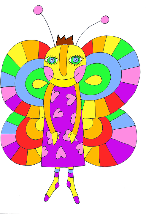 Dopo aver scaricato le 2 pagine che vedete qui sotto (la farfalla colorata è dimostrativa) i bambini per prima cosa dovranno appunto colorare Lina come da indicazioni, disegnare i cuori nel vestito, poi ritagliare i quattro petali e colorarli di giallo, per le striature io ho pensato di farle sia nel fiore che prendendo altri pezzetti di carta a strisce sottili da mettere tra i petali (vedi foto dimostrativa)