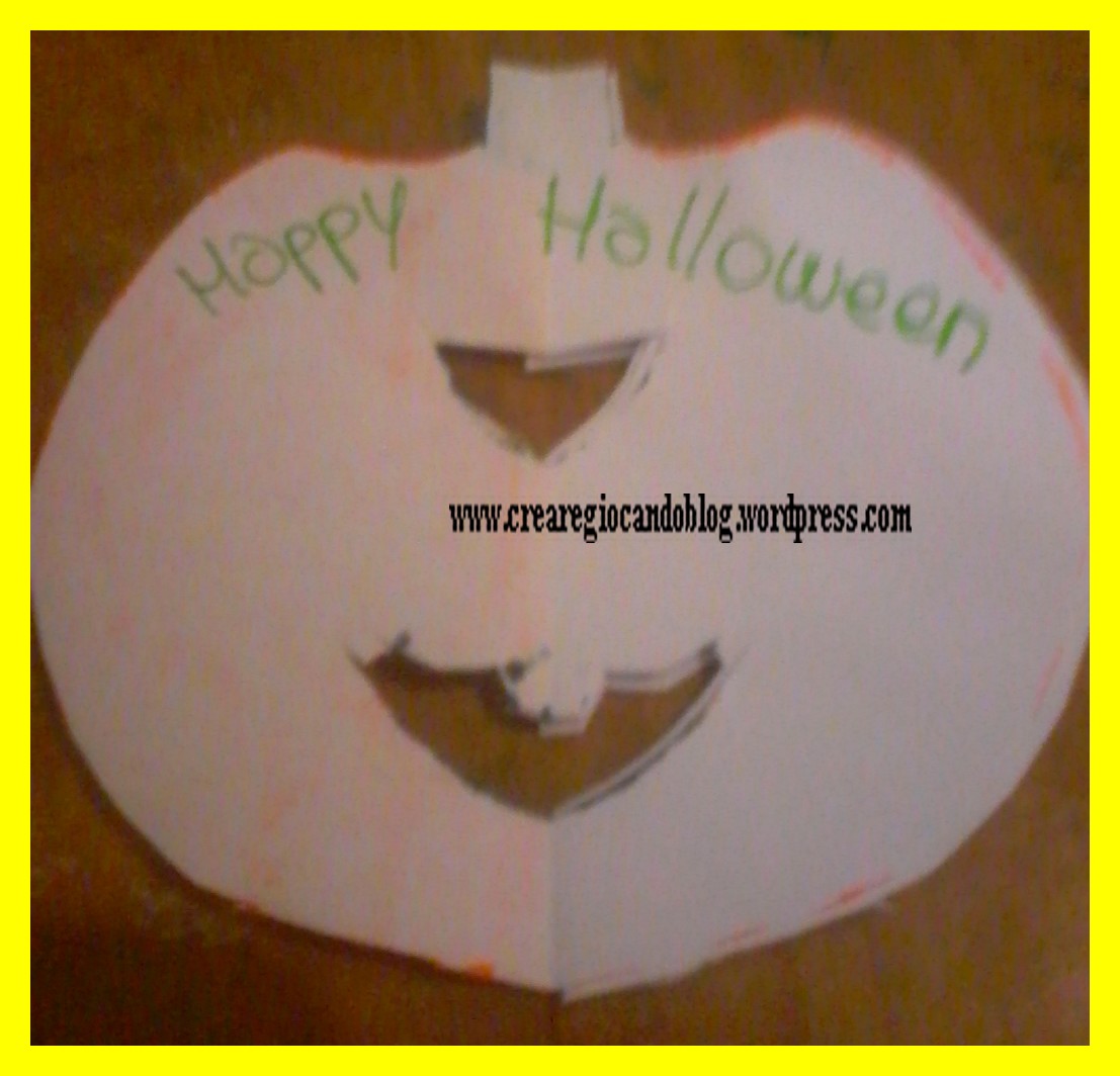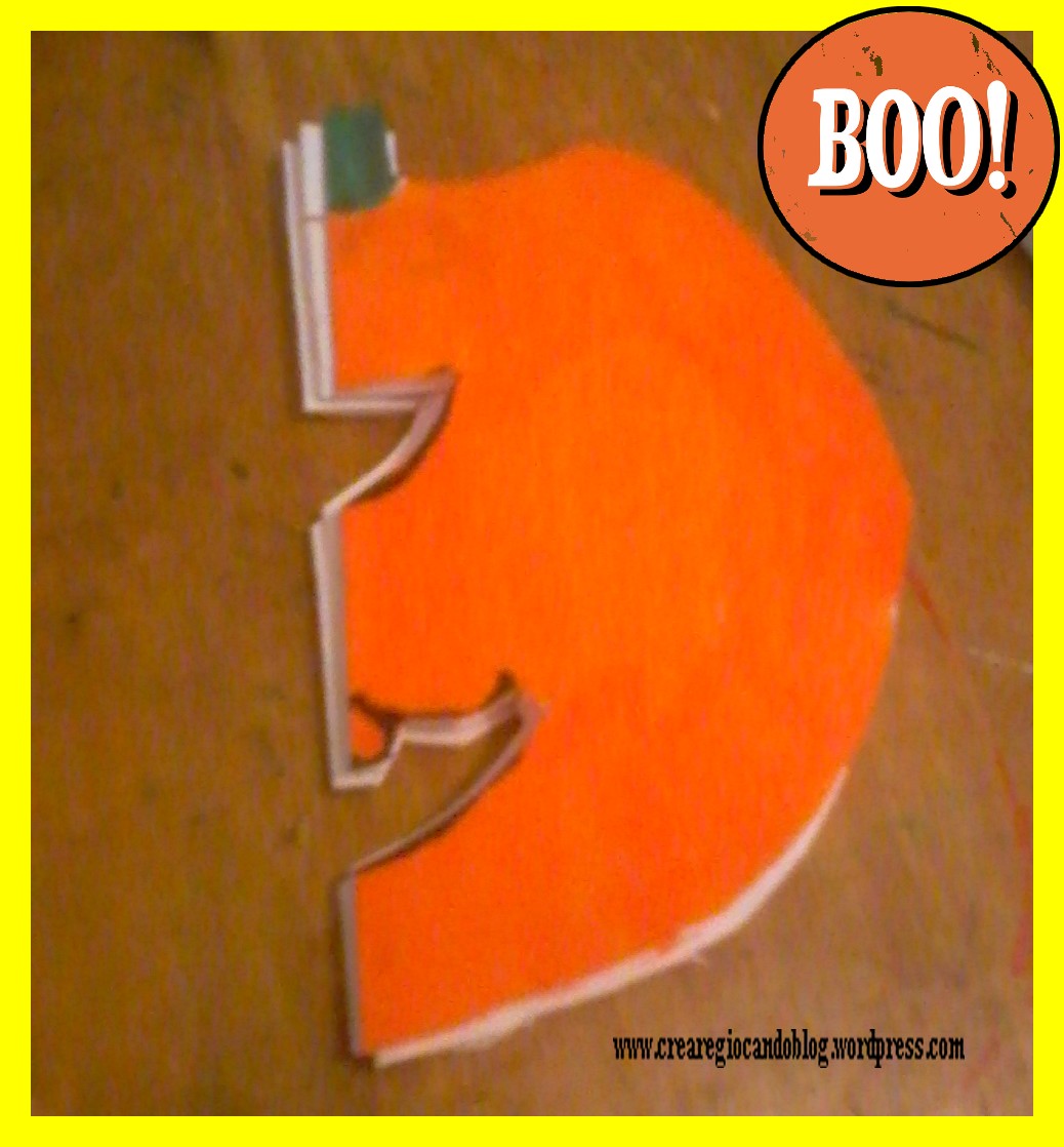Piegate a metà i fogli e disegnate una metà zucca, ritagliate e incollate i fogli uno dietro l’altro. A questo punto formate la bocca e l’occhio (ne ho fatto solo 1 per non avere poi troppo poco spazio all’interno) ritagliate, colorate la copertina di arancione e ora…..