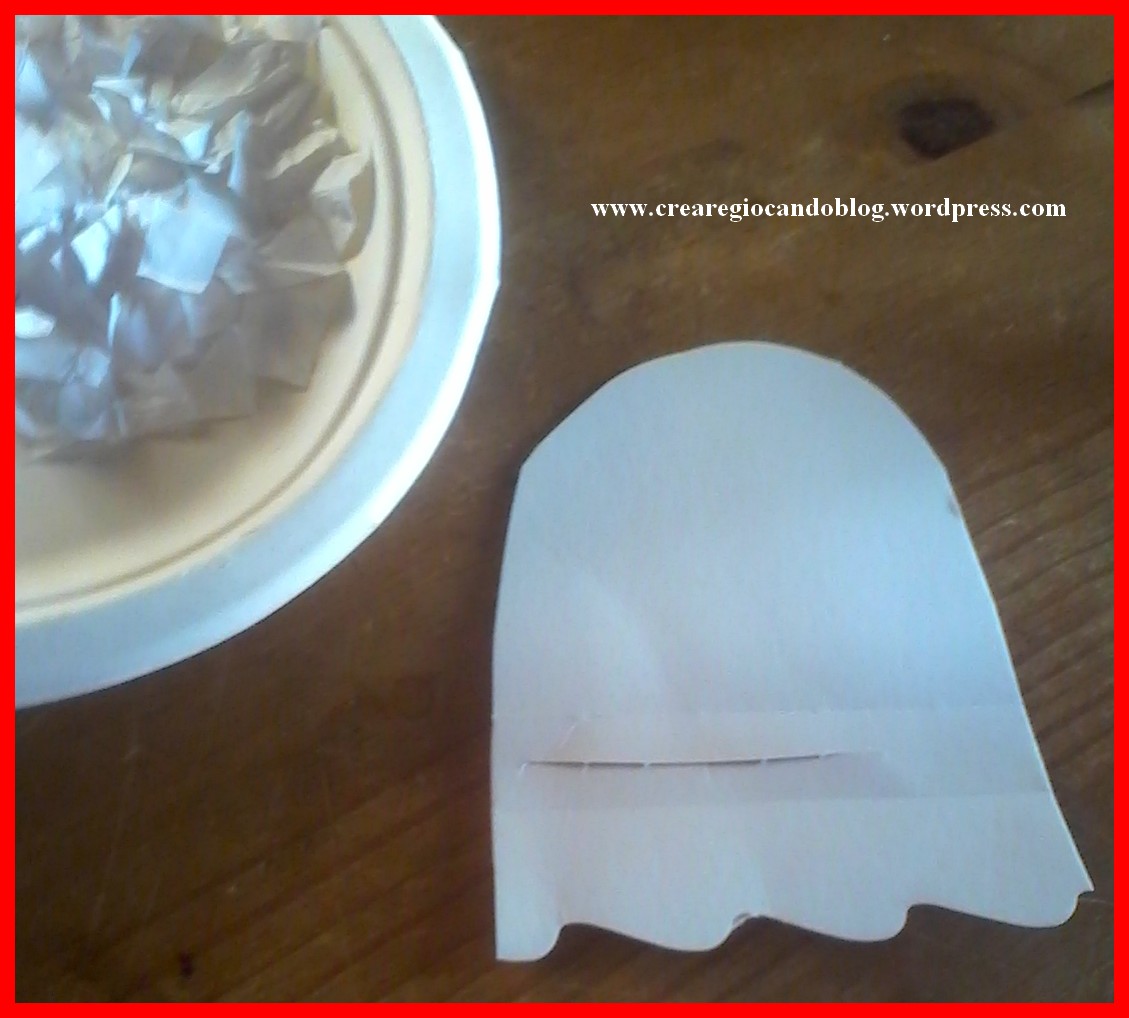 Prendete ora un pezzo di cartone di riciclo e tagliatelo a fantasmino (nel mio caso il fondo del cartone era già ondulato, ma potete farlo voi, fate ora al centro un taglio con la forbice ma meglio con il taglierino.