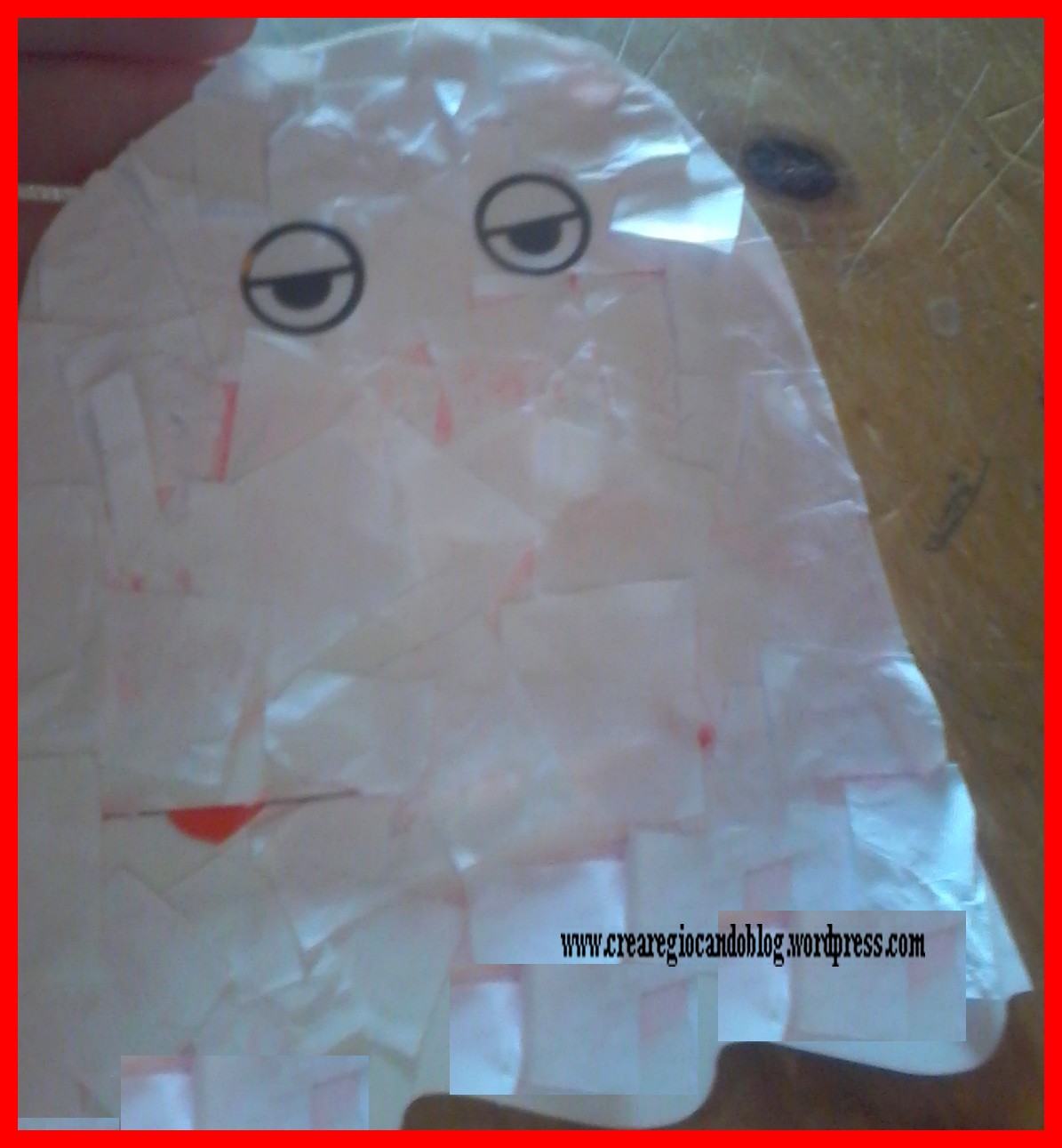 A questo punto mettete la colla (la mia come vedete sopra è di colore rosso) e attaccare i quadretti al fantasmino, ripassare il taglio al centro e fare sbucare da dietro la lingua (cartone rosso) fare gli occhi e la bocca del fantasma.