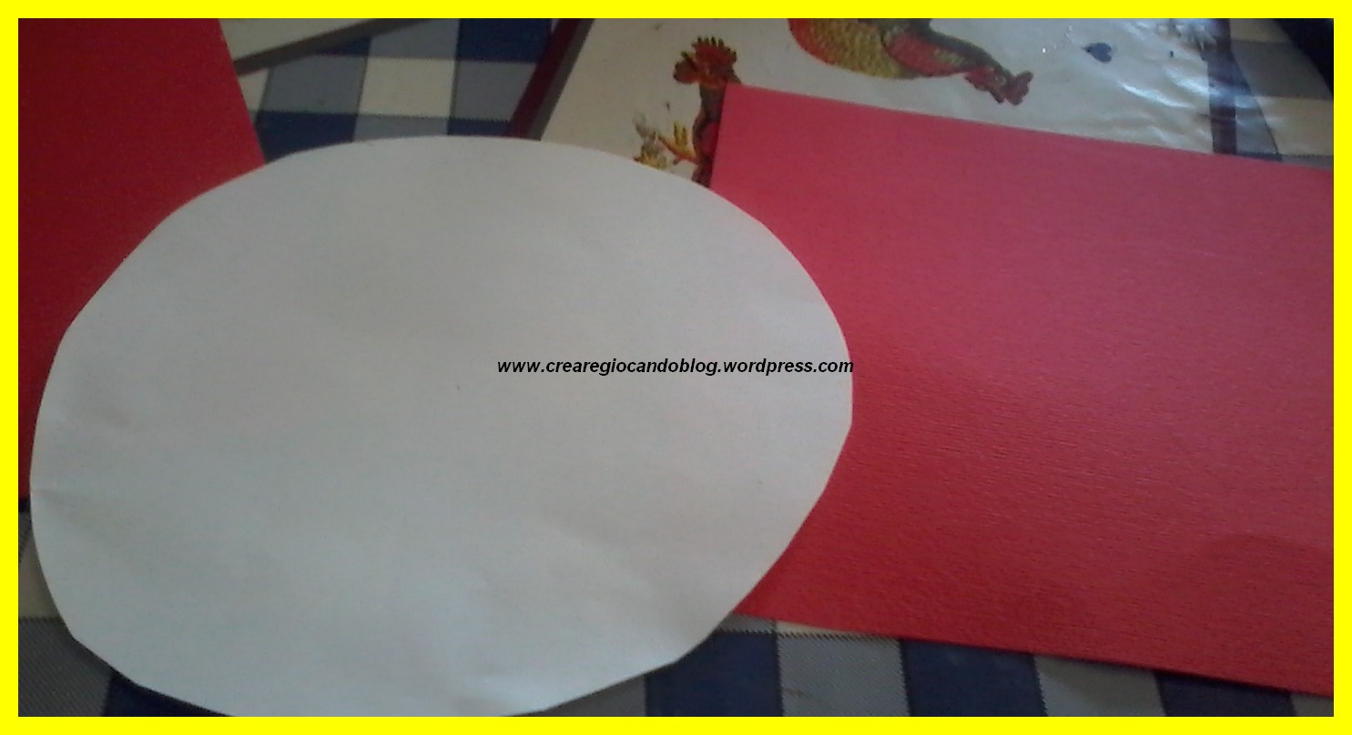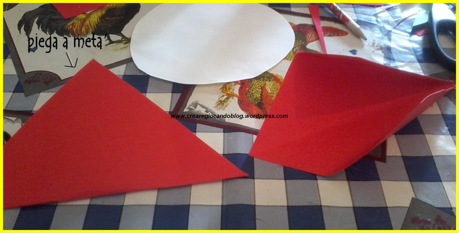 Per prima cosa dobbiamo ottenere 2 quadrati dal cartoncino rosso, dal foglio bianco invece facciamo un bel cerchio, come vedete dalle foto… non serve sia precisissimo!