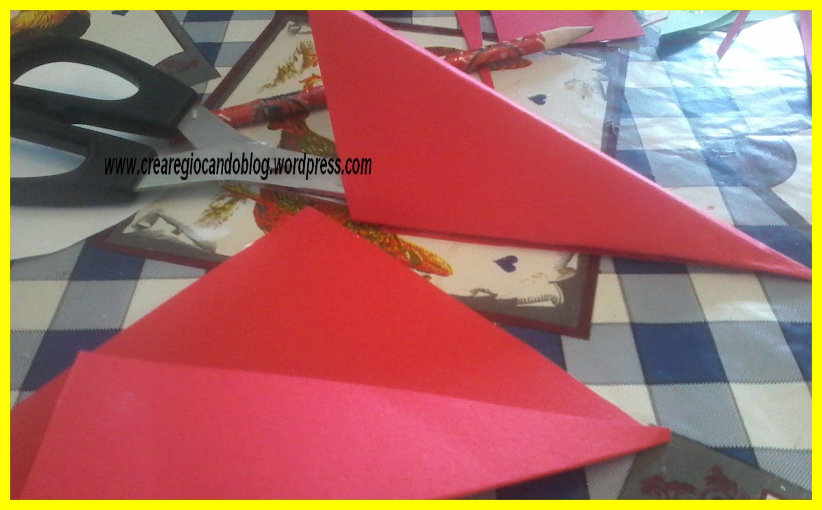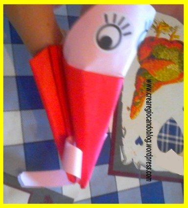 A questo punto piegate a metà i quadrati rossi di cartoncino e poi di nuovo a metà tutte e 2 le parti (nella seconda foto ho cercato di farvi vedere nel foglio aperto), ora INCOLLATE e con un rettangolino rosso unite i 2 triangoli 3d ottenuti per formare il becco (vedi sotto).
