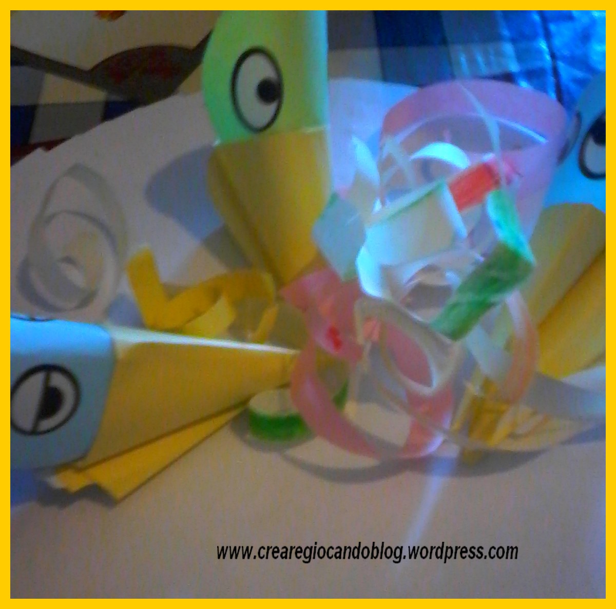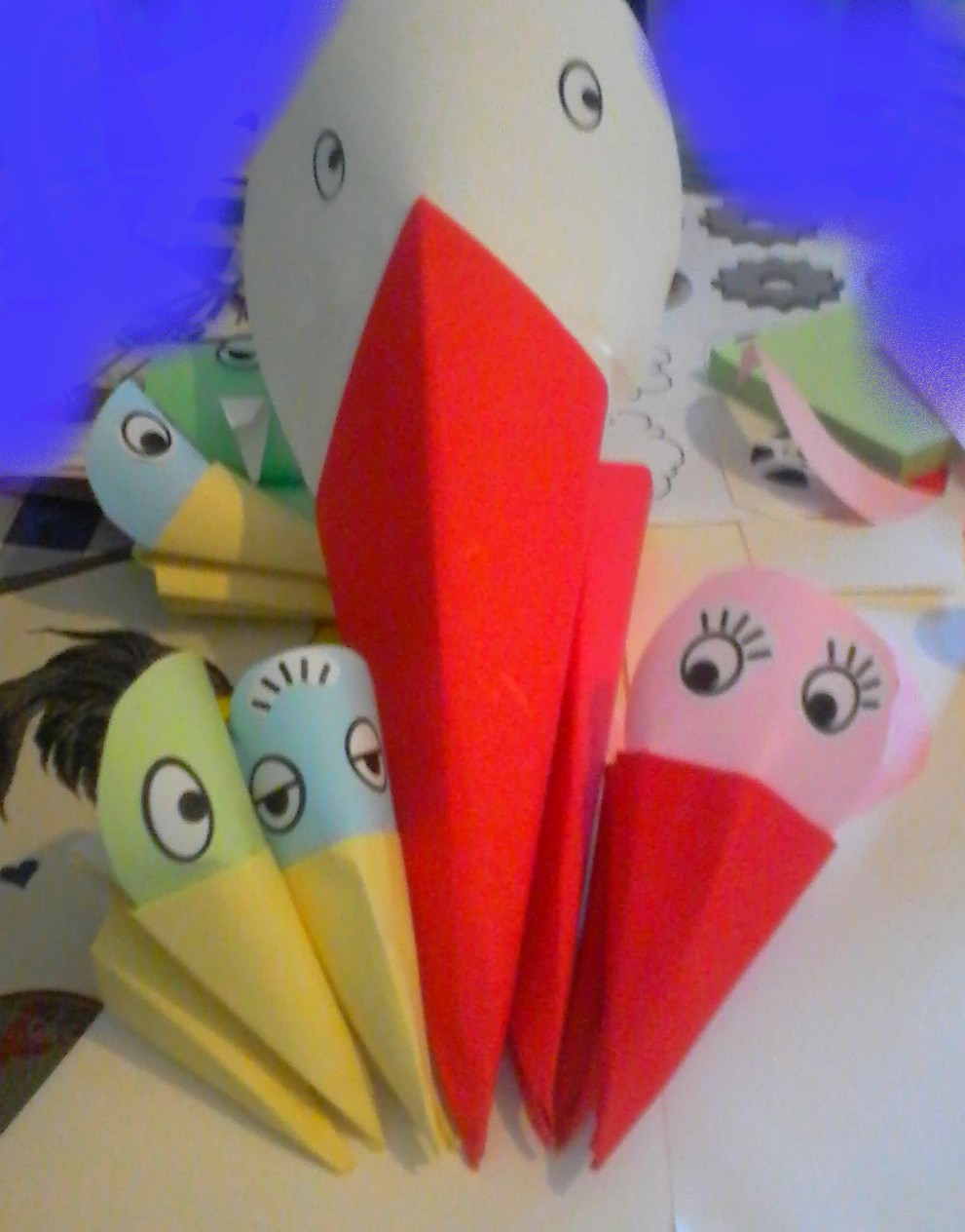 Una volta costruita la nostra famiglia cicogna possiamo fare un bel gioco. Per prima cosa prepariamo un nido con un semplice foglio di carta bianco tagliato tondo e tanti piccoli vermetti, semplicemente facendo delle strisce di carta colorata e piegandoli intorno ad una penna per fargli prendere la forma attorcigliata. Buttate in giro per la stanza i vermetti e ora mettete i piccoli sul nido. Con i genitori cicogna (uno per ogni bambino, quindi gli adulti cicogna possono essere di più) dovremo correre a prendere più vermi possibile con il becco della cicogna (NON SI POSSONO USARE LE MANI) e portarli nel nido dei più piccoli!!!!! Se volete rendere il gioco più difficile ogni bimbo deve prendere i vermi DI UN SOLO COLORE a lui assegnatogli, vince chi ne prende di più!!!!